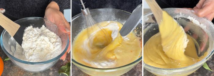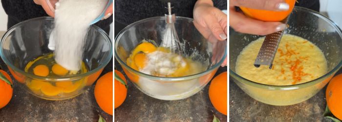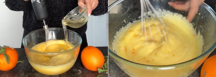 Aggiungete alle uova montate anche la scorza grattugiata e il succo delle arance.
