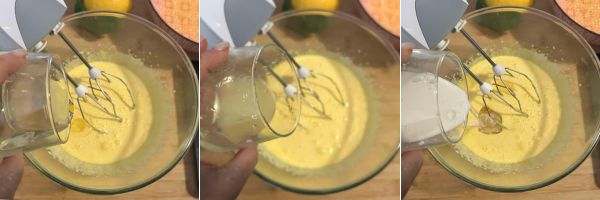 Aggiungete alla crema di tuorli: il succo di limone, l’olio di semi e il latte.