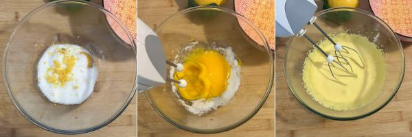 Aggiungete ai tuorli lo zucchero, la scorza di limone e montateli con le fruste elettriche fino a quando diventeranno cremosi.