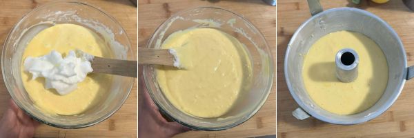 Montate gli albumi a neve e unite all’impasto della ciambella al limone poco per volta e mescolate delicatamente dal basso verso l’alto con l’aiuto di una spatola.