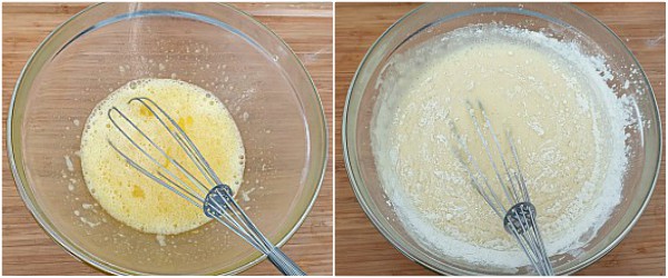 Aggiungete al composto il latte tiepido e mescolate sempre con la frusta.