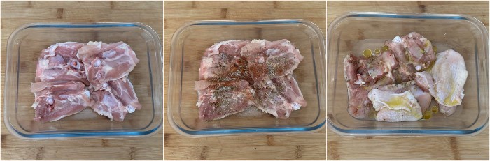 prendete i pezzi di pollo e salateli, massaggiateli con le mani in modo che il sale penetri perfettamente nella carne.