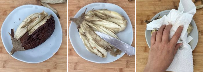 Quando la melanzana al forno sarà ben fredda, rimuovete la buccia e tamponatela con della carta da cucina cercando anche di appiattirla un pochino e salatela.