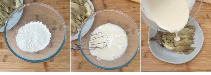 In una ciotola mescolate la farina con l’acqua ottenendo una pastella piuttosto fluida e mettete in un contenitore capiente il pane grattugiato.