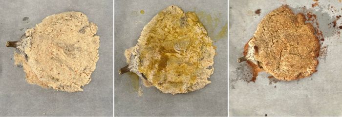 Mettete la melanzana panata su un teglia con carta forno e irroratela di olio extra vergine d’oliva.