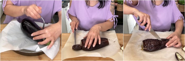 Cuocete la melanzana intera in forno statico a 200° per 40 minuti circa, sfornatela e lasciatela raffreddare completamente.