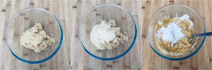 Trasferite la crema di ceci in una ciotola e mettete la farina di ceci, la fecola di patate, ed impastate fino ad ottenere un composto ben lavorabile.
