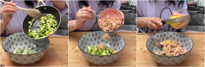 In una ciotola capiente, mettete le zucchine cotte in padella, il tonno sott’olio ben sgocciolato, la scorza grattugiata e il succo del limone.