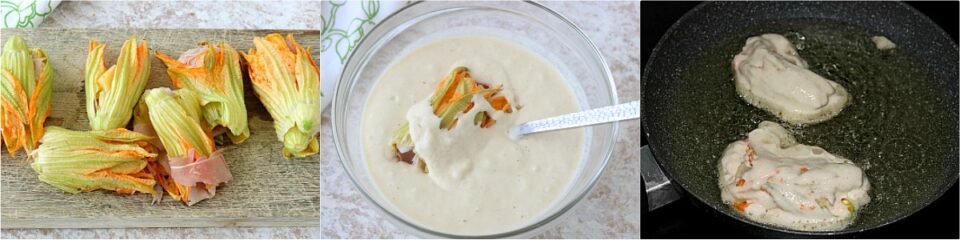 Vediamo come farei fiori di zucca fritti con prosciutto e formaggio!