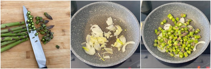 Aggiungete gli asparagi a rondelle, salateli e lasciateli cuocere a calore medio per circa 10 minuti.