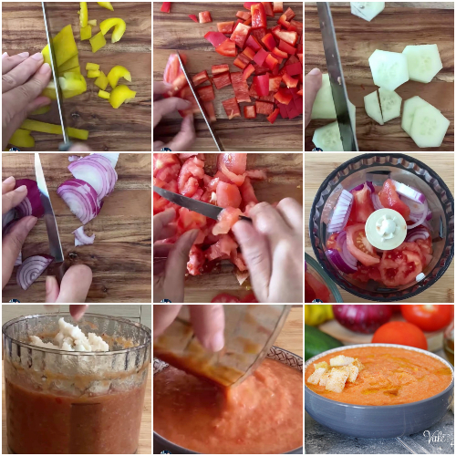 Io ho preparato la ricetta con peperoni, cetrioli, pomodori a cui ho aggiunto anche il pane ammorbidito in acqua e aceto, il protagonista è il pomodoro ma non solo, in alcune ricette si prepara addirittura con la frutta.
