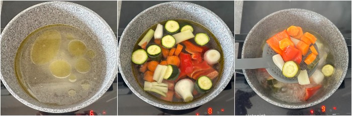 Portate a bollore e aggiungete le verdure, solitamente si mettono prima le verdure che hanno una cottura più lunga ( carote e sedano), ma io ho messo tutto insieme perché le preferisco più croccanti.