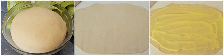 Riprendete l‘impasto e sgonfiatelo delicatamente, trasferitelo su un piano da lavoro leggermente infarinato, con le mani o con un mattarello allargatelo per ottenere un rettangolo dello spesso di mezzo cm.