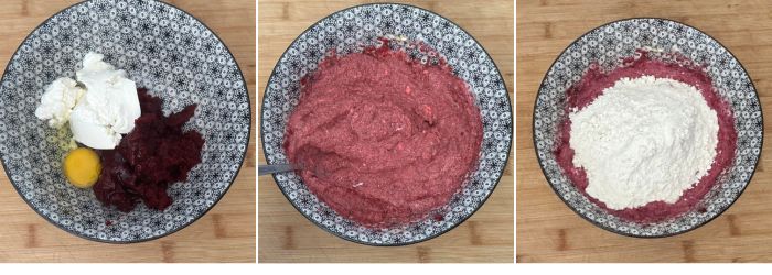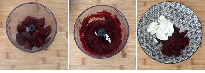 Frullatele e mettete la purea di barbabietola in una ciotola e aggiungete la ricotta.