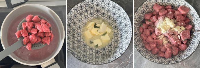Cuocete gli gnocchi di barbabietole e ricotta in abbondante acqua salata.