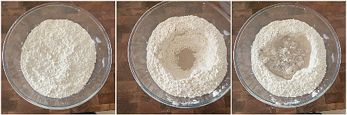 Fate un buco al centro e unite il lievito di birra e metà acqua.