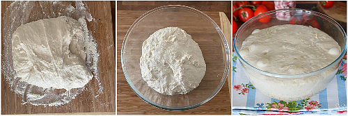 Trascorsi i 20 minuti, rovesciate la pasta per pizza su un piano da lavoro infarinato e lavoratela con le mani aiutandovi anche con un tarocco per staccarla dal piano.