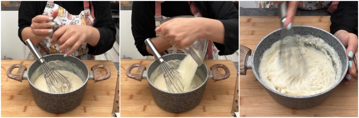Togliete la pentola dal calore e mettete tutta la farina 00, mescolate velocemente, rimettete sul fuoco e aggiungete anche il latte.