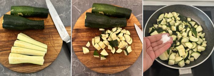 Lavate, spuntate e tagliate le zucchine a pezzetti.