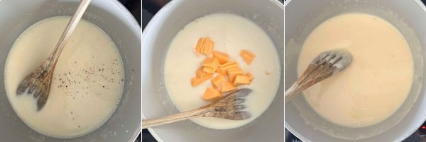 Togliete la besciamella dal calore e aggiungete il cheddar, mescolate per farlo sciogliere e tenete la crema al formaggio da parte.