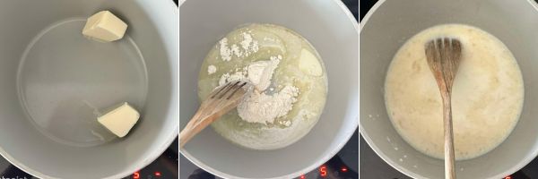 Aggiungete la farina e mescolate velocemente, aggiungete anche il latte caldo e continuate a mescolare la salsa.