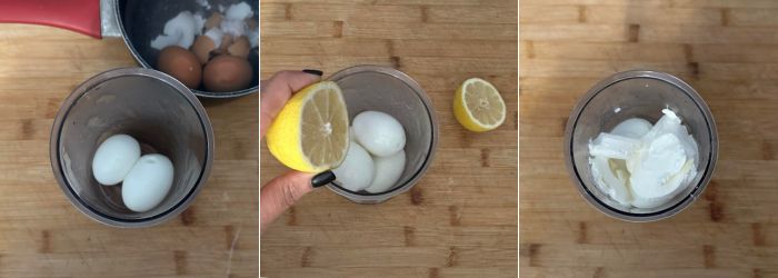 Sgusciate le uova cotte e mettetele nel boccale del frullatore a immersione.