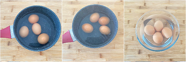 Per preparare la maionese senza uova crude e senza olio per prima cosa mettete a rassodare le uova in un pentolino con acqua fredda, portate a bollore e lasciatele cuocere per 9 minuti, trasferite poi le uova sode in una ciotola con acqua fredda e lasciatele raffreddare.