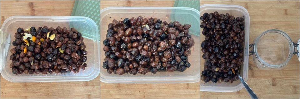 Mettete le olive secche in un contenitore e aggiungete: lo spicchio d’aglio a pezzetti, il peperoncino, l’origano, la scorza d’arancia e di limone a pezzetti e l’olio extra vergine d’oliva.
