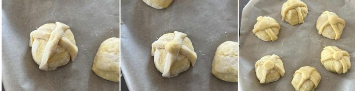 Mettete i panini dolci su una teglia con carta forno, con la pasta tenuta da parte realizzate dei cordoncini, incrociateli su ogni panino e mettete una pallina di impasto al centro.