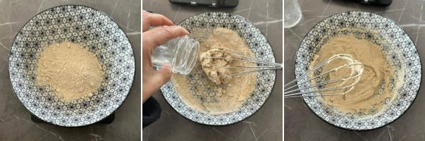 In una ciotola mettete la farina di avena e poco per volta iniziate ad aggiungere l’acqua mescolando con una frusta.