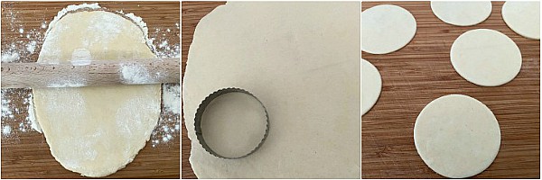 Riprendete la sfoglia delle pardulas e tiratela con un mattarello, deve essere molto sottile, con un coppapasta fate dei cerchi.