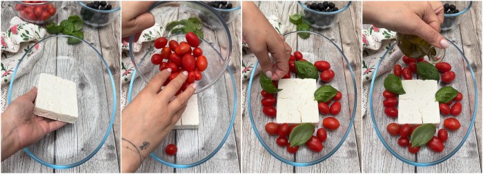 Per preparare la pasta con feta greca e pomodori per prima cosa mettete la feta intera in una teglia posizionandola al centro.