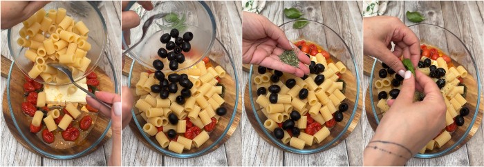 Togliete la feta dal forno, aggiungete la pasta scolata, le olive, origano e basilico.