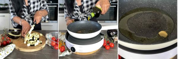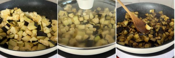 Aggiungete le melanzane a dadini, copritele con un coperchio e lasciatele cuocere a calore medio.