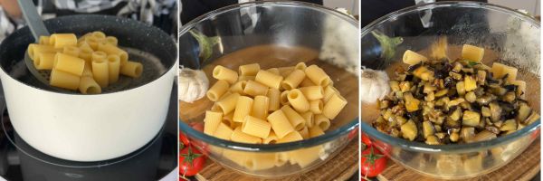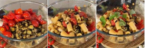Aggiungete le melanzane cotte, i pomodorini tagliati a metà e mescolate.