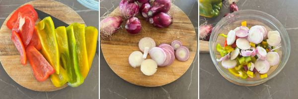 Preparazione della teglia di peperoni e cipolle al forno