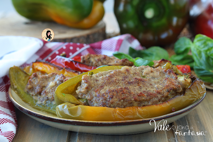 Peperoni ripieni di carne una ricetta che tutti conoscete e che piace sempre, io ho una vera e propria passione per i peperoni, chi mi segue ormai lo sa, li mangerei anche a colazione se dipendesse da me, con buona rassegnazione del mio stomaco, i peperoni ripieni al forno sono perfetti in ogni occasione, ci sono tantissime ricette di questa pietanza che variano a seconda della regione, i peperoni imbottiti alla napoletana con olive e pangrattato oppure i peperoni alla siciliana con olive e capperi, io credo di averli in tantissimi modi come i PEPERONI RIPIENI DI PATATE TONNO E OLIVE oppure i PEPERONI RIPIENI DI PATATE E SALSICCIA insomma nei peperoni possiamo metterci di tutto! La ricetta che vi lascio in questo post è quella classica, i peperoni ripieni di carne, cotti al forno, con l’impasto delle polpette nel ripieno, sono buonissimi da gustare caldo o freddi e gustosissimi! Tornando alle ricette di peperoni al forno ripieni, come vi dicevo possiamo davvero giocare con il gusto e la fantasia, io li ho preparati anche ripieni di riso, riprendendo la mia amata ricetta romana dei pomodori di riso al forno, ma potete anche prepararli in versione vegetariana con delle verdure saltate in padella e insaporite con olive, capperi, pangrattato e magari qualche cubetto di provola, quelli mi mancano e mi sono ripromessa di farli al più presto!