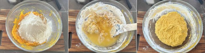Aggiungete alla purea di zucca la farina e il lievito di birra secco, se è fresco mettetelo sbriciolato con le mani.