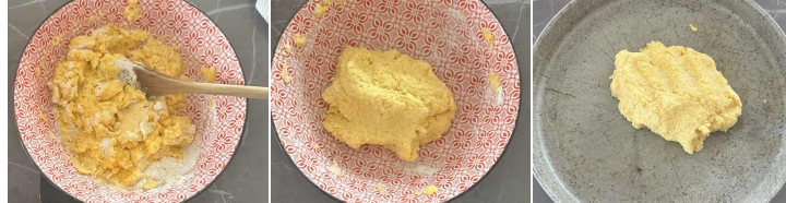 Impastate prima con un cucchiaio di legno e poi continuate con la mano fino ad ottenere un panetto.