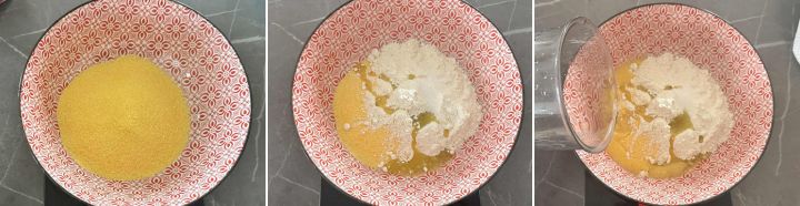 In una ciotola mettete la farina di mais per polenta, la farina 0, l’olio, il sale e aggiungete l’acqua calda.