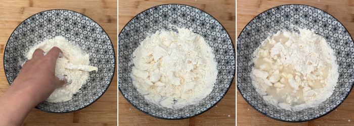 Impastate velocemente con la mano in modo da ottenere un composto sabbioso, aggiungete l’acqua fredda ed impastate ancora fino ad ottenere un panetto liscio e morbido.