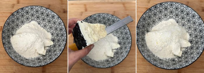In una ciotola mettete il burro a pezzetti, la farina ed il pecorino romano grattugiato al momento.