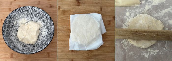 Mettete la pasta brise in un foglio di carta forno e fatela riposare in frigorifero per 30 minuti.