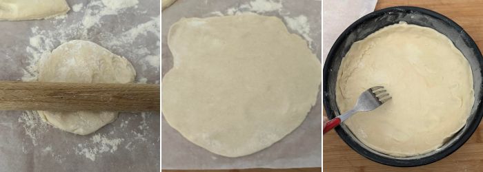Mettete la prima sfoglia nella tortiera imburrata e infarinata e bucherellatela con i rebbi di una forchetta.