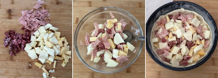 Tagliate a pezzetti il salamino, la mortadella e i formaggi, mettete il ripieno della pizza rustica romana in una ciotola e mescole in modo che gli ingredienti siano uniformi quando andrete a metterli nella base della torta rustica di Pasqua.