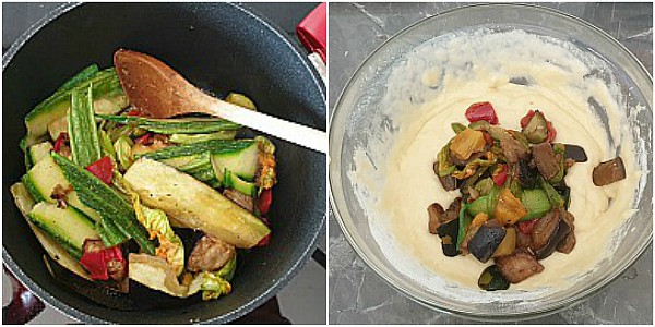 Salatele e spadellatele a fuoco medio per qualche minuto, le verdure dovranno restare croccanti perché termineranno poi la cottura in forno.