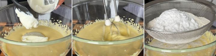 Aggiungete alla crema di tuorli lo yogurt e continuate a mescolare l’impasto del plumcake con le fruste elettriche.