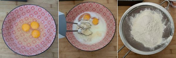 In una ciotola mettete le uova con il sale, unite il parmigiano, il pepe, il latte e l’olio.