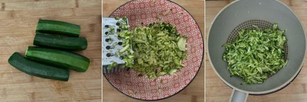 Aggiungete un pizzico di sale, mescolate e poi trasferite le zucchine grattugiate in un colino in modo che perdano la loro acqua di vegetazione.