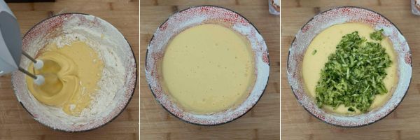 Mescolate il composto del plumcake salato sempre con le fruste e quando avrete ottenuto un impasto cremoso e senza grumi aggiungete anche le zucchine grattugiate strizzate benissimo.
